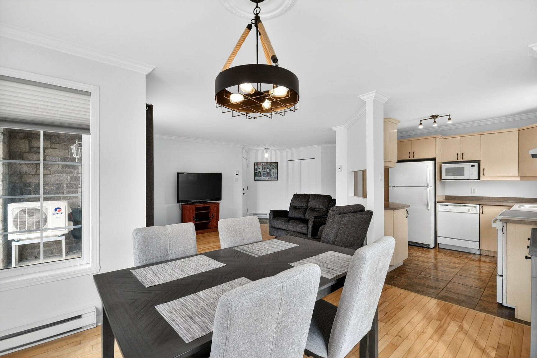 Inclus : Frigidaire, Poêle, laveuse, secheuse et le lave-vaisselle le tout vendu sans garantie légale. Luminaire, stores et rideaux.